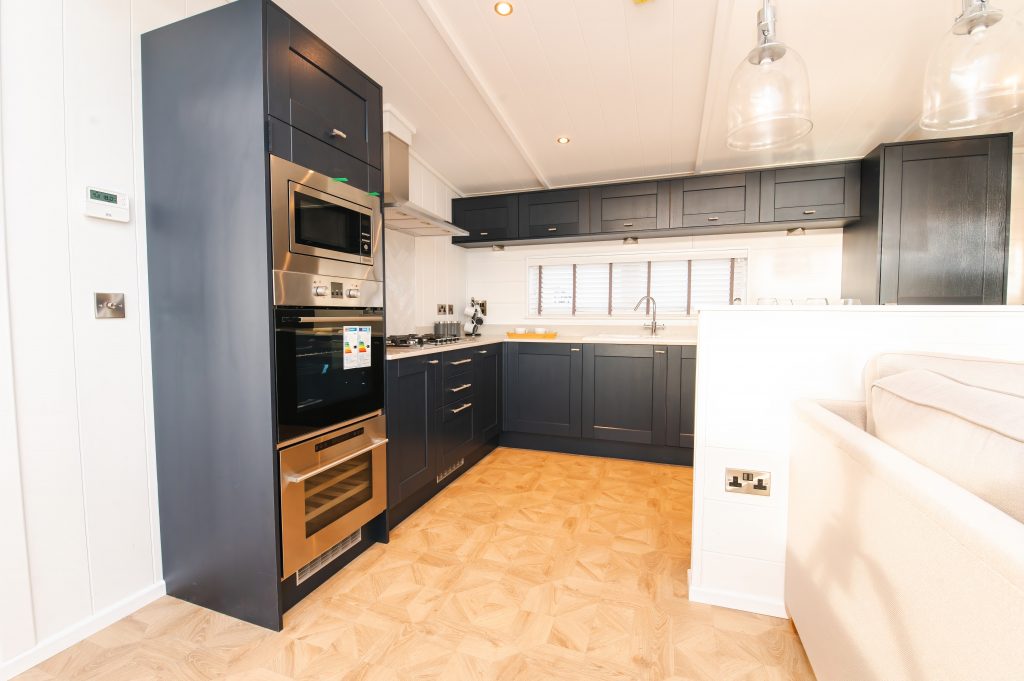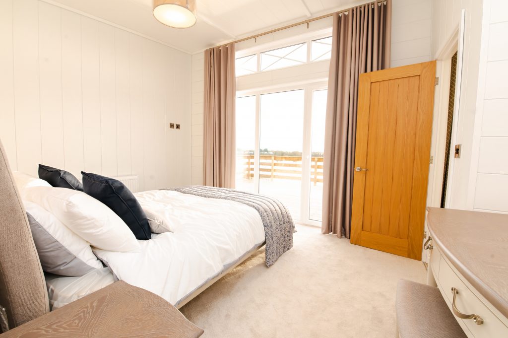 The living space is laden with beautiful creams and cashmere which frame the statement navy kitchen perfectly, allowing this new upgrade to take center stage. We completely adore the T-bar handles which display the attention to detail that has gone into designing this lodge. You can enjoy all of this, whilst simultaneously taking in the panoramic views through the bi-fold doors that span the width of the living area. Next into the master suite, we can’t think of a more perfect spot to wake up with your morning coffee and Sunday paper. Here you also have a walk-through wardrobe and dressing area, leading into your lavish en-suite. At the opposite end of the lodge, you’ll find the second bedroom, also with its own beautiful en-suite and walk-in wardrobe.